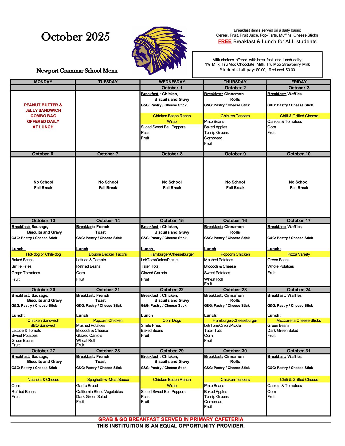 At breakfast, we serve three components: two grains, one fruit and/or juice, and milk. Students may choose three or four items from the three components for a reimbursable meal. Cereal is also served daily. We also offer a free Grab & Go Breakfast in the primary cafeteria for Kindergarten, 1st, and 2nd grade students to eat now or put in their backpack for later. These students can opt to go to the main cafeteria for a hot breakfast.